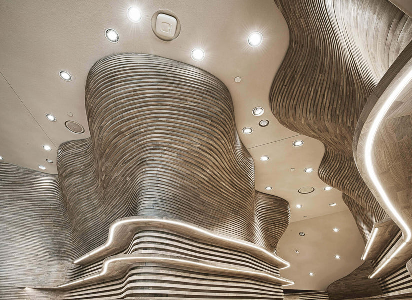 A stunning work of art where 40,000 puzzle pieces of wood contour with a curved room. Each piece is cut to fit the contour and applied with expert precision to culminate in a grand design.