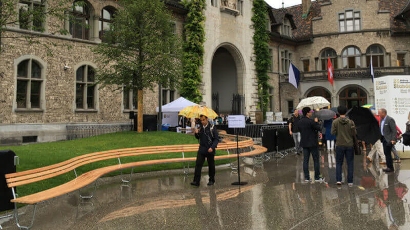 For the entrance area of the Swiss National Museum’s extension building 60 linear feet of curved benches could be realized along the winding line of the groups of trees. The solid preliminary work of Vogt Landschaftsarchitekten enabled a sound design and planning of the curved benches. By capturing the terrain with a 3D laser the data for the construction planning could be gathered and the complex sequence of the curves and angular points could be planned perfectly.